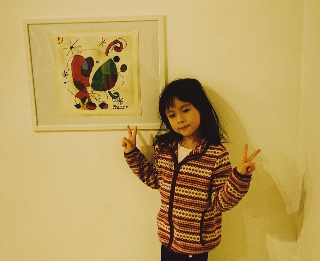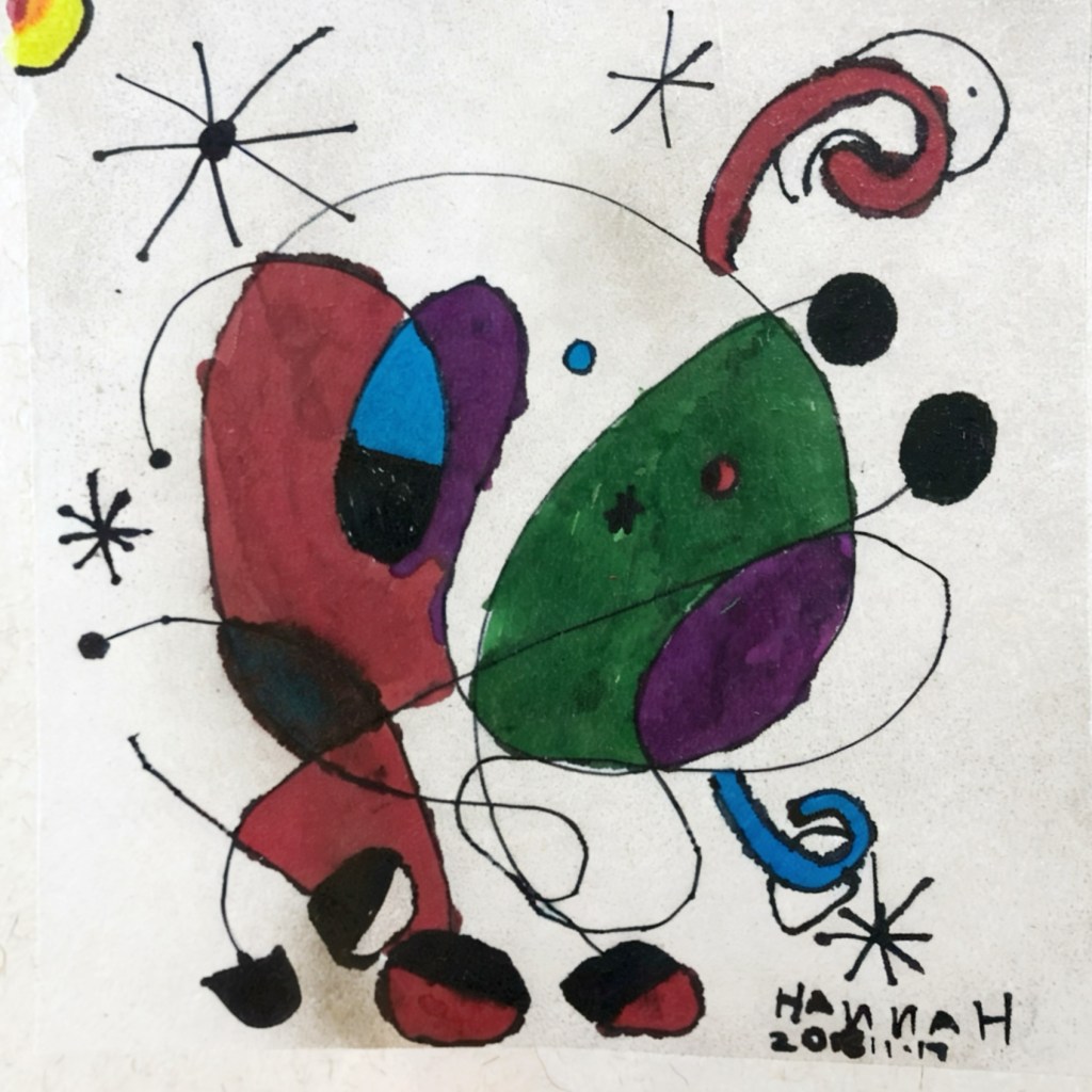 For this milestone, she presented a painting inspired by the work of Joan Miró, whose playful use of abstract shapes and bold colors deeply resonated with her. The piece reflected Hannah’s early fascination with whimsical forms and dreamlike expression, blending childlike imagination with the spirit of modern art.