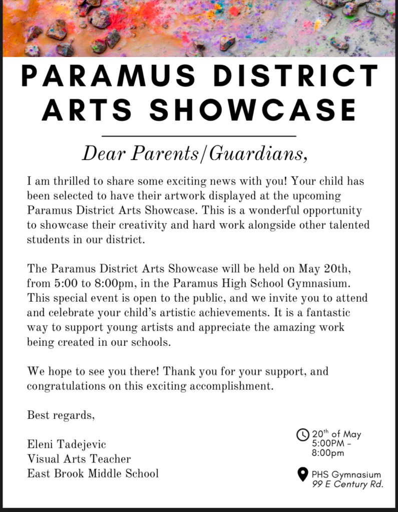Hannah’s artwork created during her middle school art class was proudly selected to be displayed at the Paramus District Arts Showcase on May 20th, held at the Paramus High School.